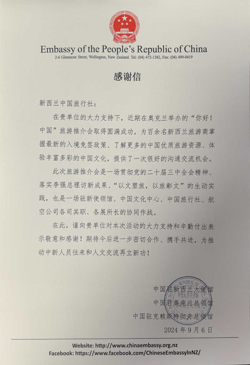 克日,,,,,,,中旅旅行所属新西兰中旅收到中国驻新西兰大使馆、中国驻奥克兰总领馆、中国驻克莱斯特恒久总领馆联名谢谢信。。。。。。。。中国驻新西兰大使馆等单位对新西兰中旅在奥克兰举行的“你好!中国”旅游推介会中提供的支持体现谢谢,,,,,,,并期待以后与新西兰中旅进一步亲近相助,,,,,,,为推动中新人文交流和职员往来再立新功。。。。。。。。
