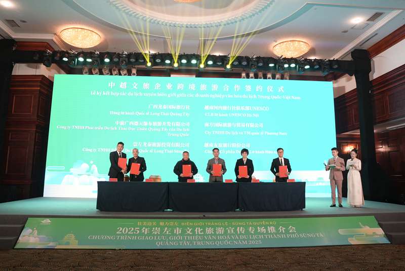 2月22日,,,,,,中旅国际所属德天景区与越南旅游机构在越南河内举行的2025年崇左市文化旅游宣传专场推介会上签署相助协议。。。。。。。。德天景区所在的中越德天(板约)瀑布跨境旅游相助区是天下首个跨境旅游相助区,,,,,,也是“一带一起”建设的重点园区。。。。。。。。自运营以来,,,,,,相助区内相继举行了“中越首届水上歌会”“首届中越衣饰秀”“首届跨国欢喜跑”等系列运动,,,,,,以其奇异的自然景物和文化旅游资源,,,,,,成为中越两国文化交流与友好往来的桥梁。。。。。。。。