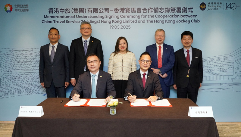 3月19日,,,,,,,集团与香港赛马会在赛马地马场签署相助备忘录,,,,,,,推动赛马旅游相助。。。。。。。香港特区政府文化体育及旅游局局长罗淑佩、中联办经济部副部长郭韶伟、香港旅游生长局主席彭耀佳、集团董事长王海民、马会行政总裁应家柏出席见证。。。。。。。集团副总司理浅易与马会客户战略、体验及立异事务执行总监侯德洋代表双方签约。。。。。。。