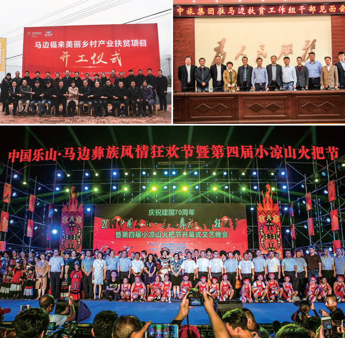 图1-3:马边福来漂亮墟落项目开工仪式;;;;;2018年4月,,,,,,,,中旅集团驻马边扶贫事情组晤面汇合影;;;;;集团与马边县政府团结主理小凉山火炬节