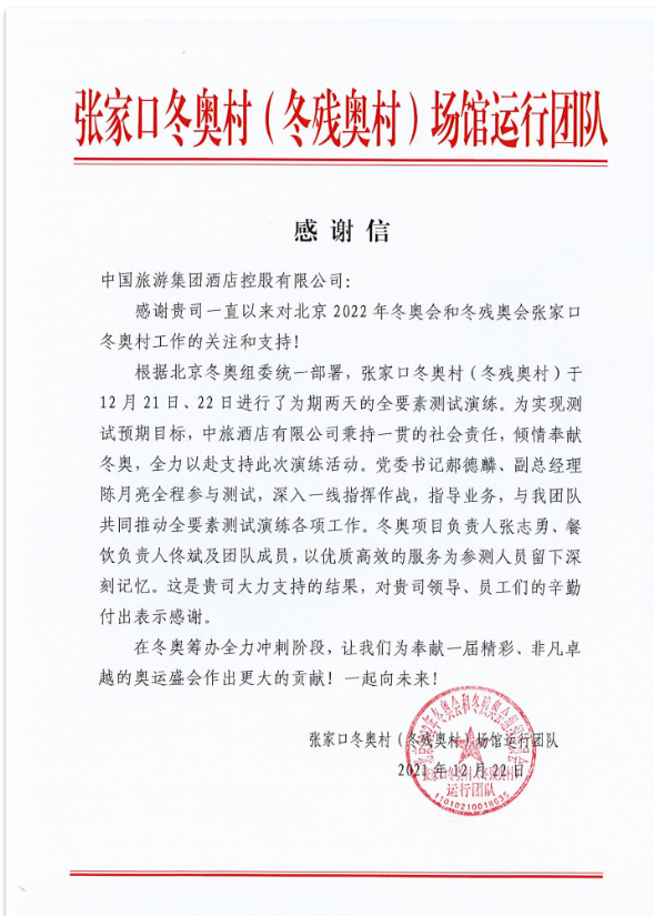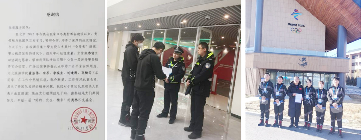 中旅效劳团队主干向导来自长春和承德的实习生,,,,,,,在全要素测试演练准备期和演练历程中均以热情和默契,,,,,,,认真认真的事情作风,,,,,,,展现了中旅效劳团队的优异精神风貌。。。。。测试前日,,,,,,,唐山市公安局冬奥村专班特殊送来谢谢信,,,,,,,谢谢住宿组左岩、张冰倩两位主干职员自动安排职员协助清洁安保用房,,,,,,,并对加入事情的5名河北旅游职业学院学生提出表扬。。。。。