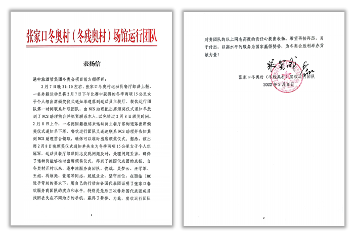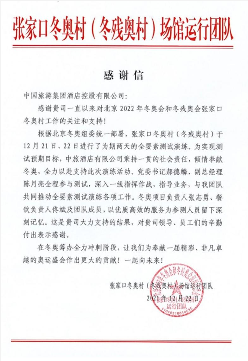 北京奥组委张家口冬奥村运行团队先后向中旅冬奥效劳团队专致谢谢信,,,,,,对中旅团队急人所急、主行动为的贡献精神和兢兢业业、坚守岗位的敬业精神提出表扬,,,,,,以多个真人真事归纳综合了冬奥村开村以来的“中旅冬奥效劳故事”,,,,,,同时,,,,,,信中点名表扬了多位中旅效劳职员。。。。。。