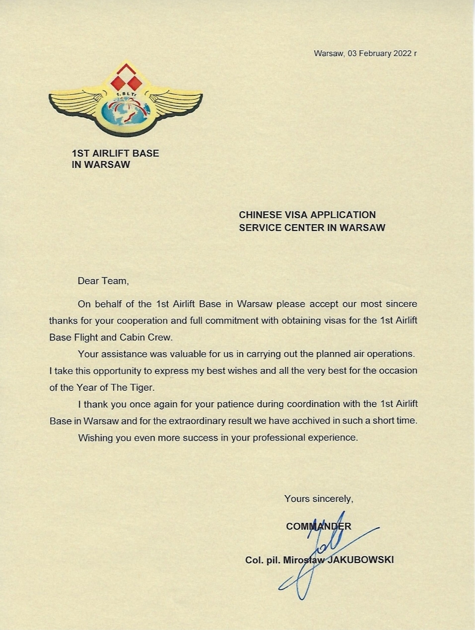 集团中旅旅行所属境外各签证中心为有关国家和地区参赛职员及赛事相关职员提供专业高效的签证申请效劳,,,,,,让他们在踏入中国国门之前就感受到中国人民的热情友好,,,,,,详尽入微的效劳给各国参赛职员留下了深刻的印象,,,,,,陆续收到来自我驻外使领馆、各国冬奥团组的谢谢翰札。。。。。。其中,,,,,,执飞波兰总统杜达访华专机的波兰空军一号基地总司令Miroslaw JAKUBOWSKI将军署名的谢谢信,,,,,,对华沙签证中心为专机机组职员治理加急签证提供便当条件和热情效劳给予高度评价。。。。。。