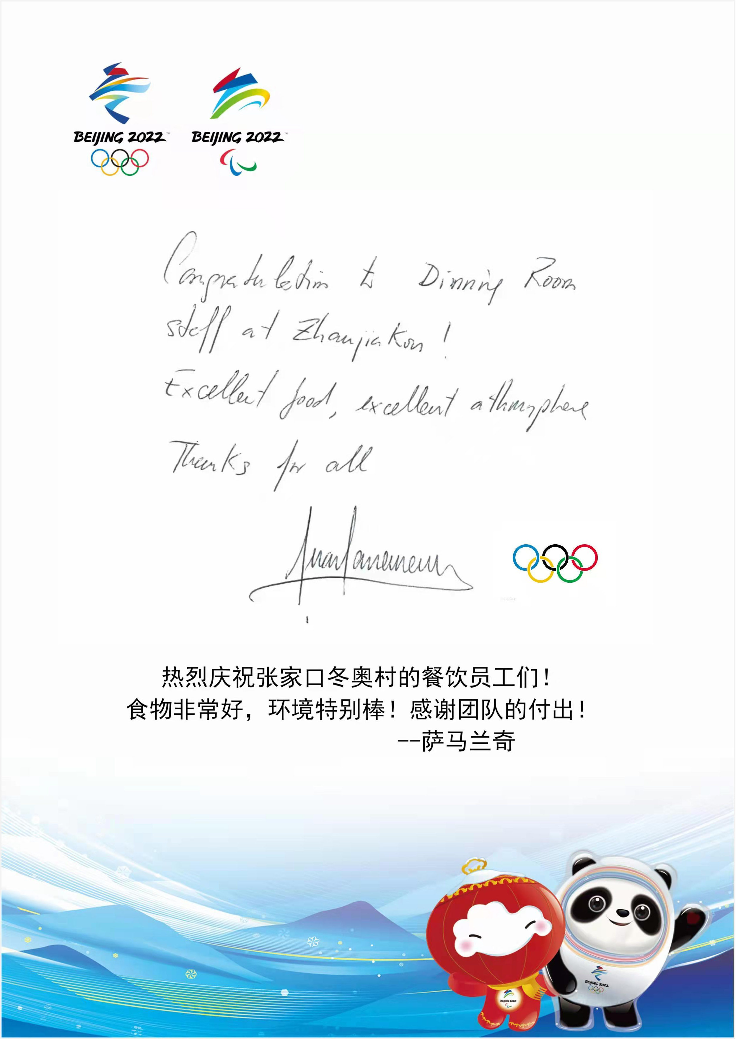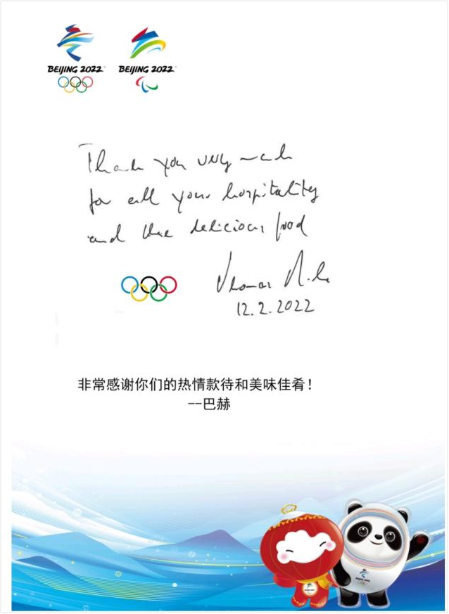 集团中旅旅馆高质量高标准提供住宿餐饮效劳、接待效劳,,,,,,全力以赴做好各项效劳包管事情,,,,,,受到国际奥委会多次赞扬。。。。。。国际奥委会主席巴赫在张家口冬奥村运发动餐厅就餐后,,,,,,特殊留言点赞张家口冬奥村的餐饮效劳,,,,,,写道:“很是谢谢你们的热情效劳和鲜味佳肴”。。。。。。国际奥委会北京冬奥会协调委员会主席胡安·安东尼奥·萨马兰奇“微服私访”张家口冬奥村运发动餐厅,,,,,,经由手消、选餐、取餐、用餐等一系列流程的亲自体验,,,,,,他对张家口冬奥村的餐饮效劳赞一直口,,,,,,并专门手写谢谢留言。。。。。。