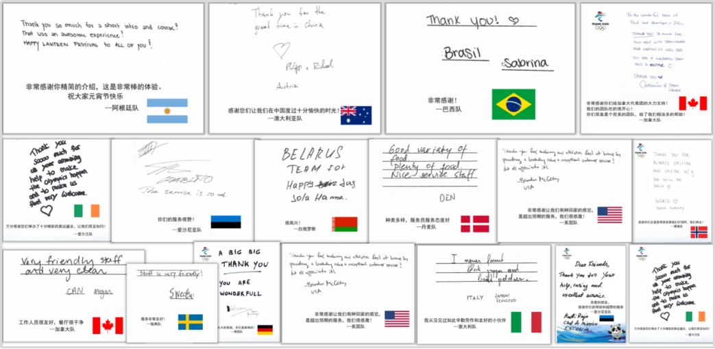 北京冬奥开村以来,,,,,,中旅冬奥效劳团队陆续收到来自美国、加拿大、俄罗斯、法国、意大利、瑞典等国代表团的谢谢信。。。。。。信中对中旅团队提供的热情、详尽、专业的效劳予以一定,,,,,,并对事情职员体现衷心谢谢。。。。。。有关谢谢信体现,,,,,,“住宿和餐饮的感受能够直接影响远道而来的外国友人关于冬奥会以致对中国的整体感观。。。。。。中国人都讲宾至如归,,,,,,正是你们详尽周密的效劳,,,,,,增进了冬奥会的顺遂举行,,,,,,也让各人感受中国的大国风范。。。。。。”来自美国代表团的官方谢谢信信中提及,,,,,,在2月9日至10日美国队运发动大规模转场这一最重大的过渡期,,,,,,中旅效劳职员逾越期待,,,,,,实时完成了房间扫除和整理,,,,,,让新入村的职员感应很受接待。。。。。。