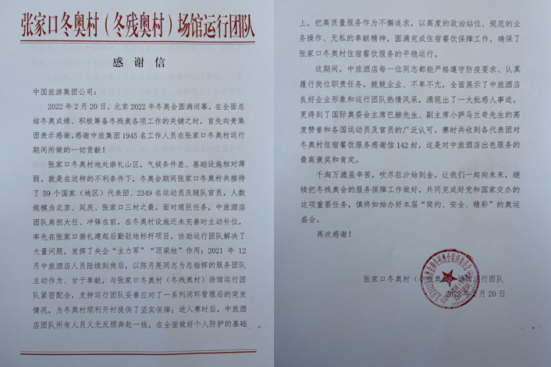 2月20日,,,,,张家口冬奥村(冬残奥村)场馆运行团队向集团专致谢谢信。。。。。。
