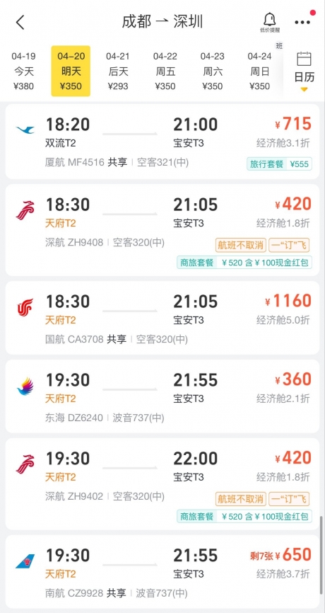 (图:飞猪App上可预订深圳航空、四川航空“一订飞”“订就飞”航班)