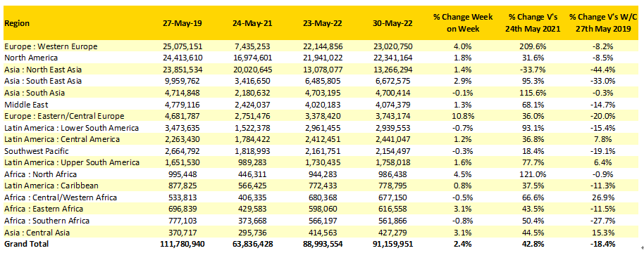 本周全球航空运力再次突破9000万个座位数,,,,,,,,抵达9120万。。。。。。。。比上周增添了2.4%,,,,,,,,新增了210万个座位,,,,,,,,这也是疫情以来单周最高的运力值。。。。。。。。这周运力增添显着的地区包括欧洲,,,,,,,,该地区增添占有整体增量的一半以上,,,,,,,,体现该地区休闲游需求的苏醒,,,,,,,,今年夏日需求将充分恢复。。。。。。。。