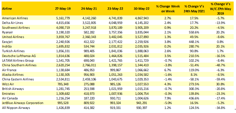 航司运力Top 10名单本周没有转变,,,,,,,,而第11-20位的排名则有所转变。。。。。。。。Wizz航空从第18名上升到了第15名,,,,,,,,比照2019年同期增添了近三分之一的运力。。。。。。。。