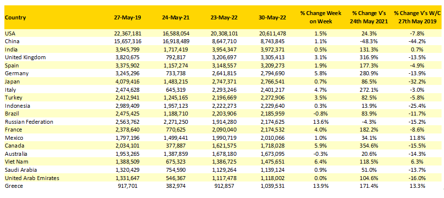 同比增添最快的是希腊,,,,,,,,也正因此,,,,,,,,希腊本周才得以跻身Top 20之列,,,,,,,,将哥伦比亚挤出排行榜。。。。。。。。本周希腊运力环比增添13.9%,,,,,,,,比疫情之前的水平横跨13.3%。。。。。。。。这关于希腊及其乌佐酒生产商而言是好事,,,,,,,,由于这意味着有更多的游客将到访希腊,,,,,,,,哪怕机场要排起长龙。。。。。。。。