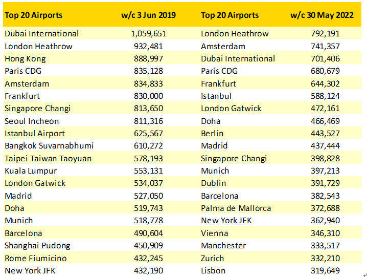 随着西欧市场继续强势苏醒,,,,,,,,国际机场的排行榜也变得颇具看点。。。。。。。。现在全球Top 20的国际机场排行榜仍然由欧洲枢纽机场垄断,,,,,,,,西欧机场占有了16个席位。。。。。。。。而值得关注的榜单缺席者包括有中国香港及台北、韩国仁川、泰国曼谷、马来西亚吉隆坡等机场,,,,,,,,而新加坡机场已经回归Top 20之列,,,,,,,,排在第11名,,,,,,,,不过新加坡机场也执偾恢复了2019年同期一半的运力。。。。。。。。伦敦希思罗机场本周拔得头筹,,,,,,,,阿姆斯特丹紧随厥后。。。。。。。。