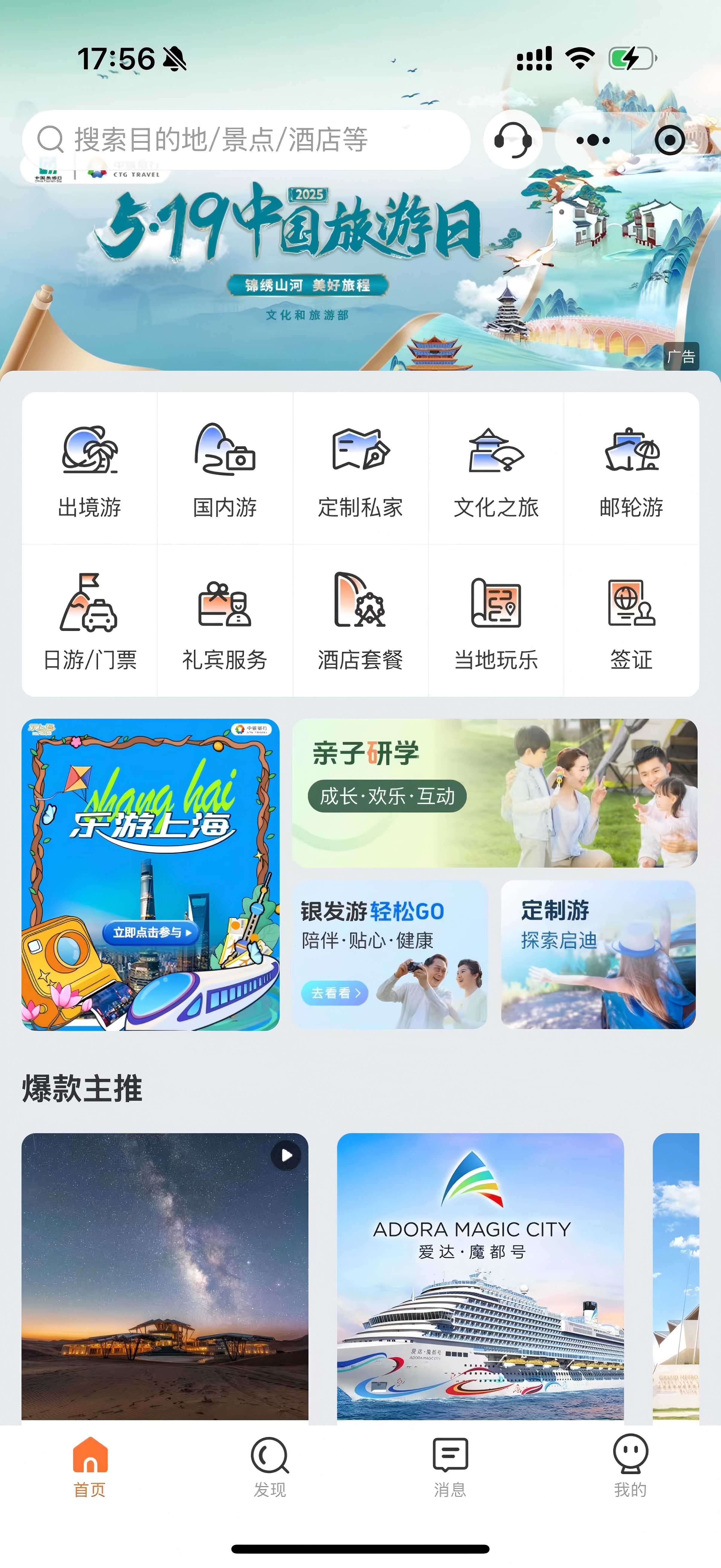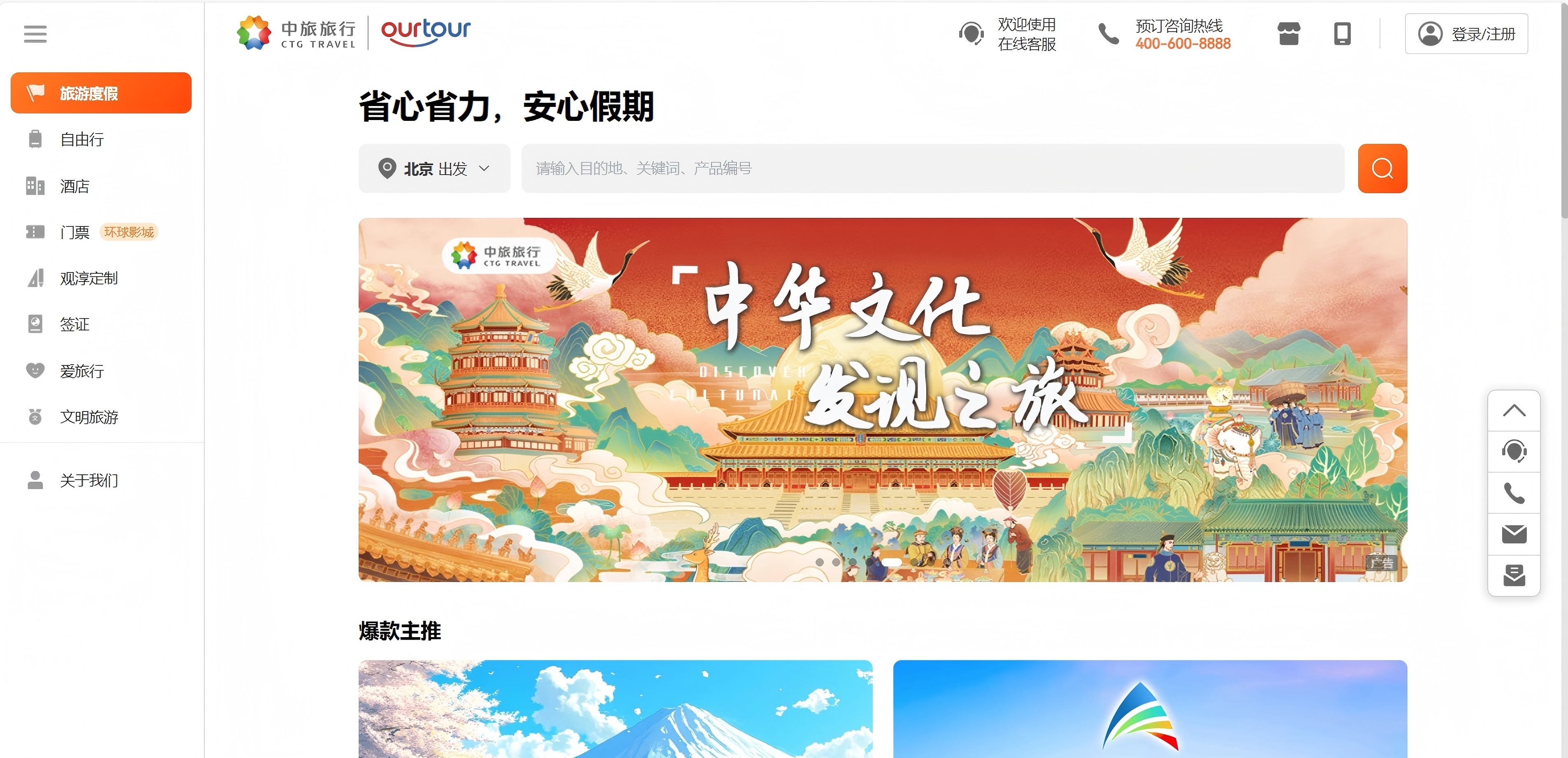 “中旅旅行”线上销售平台包括PC网(www.ourtour.com)、App和小程序,,,,,,提供海内及出境跟团游、自由行、定制游、邮轮、机票、旅馆、签证等旅游产品一站式效劳。。。。。“中旅旅行”将中旅、国旅、港中旅三大品牌的优质旅游资源举行整合,,,,,,举行统一的展现和销售;;;;;整合集团内维景旅馆、星旅邮轮、景区、旅游金融等优质资源,,,,,,升级具有焦点竞争力的自有产品系统,,,,,,知足消耗者的优美出行需求。。。。。